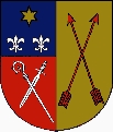 "Schild gespalten und vorne geteilt. Oben in Blau über zwei silbernen Lilien ein goldener Stern. Unten in Rot schräggekreuzt silberner Abtsstab und silbernes Schwert. Hinten in Gold zwei schräggekreuzte rote Pfeile."