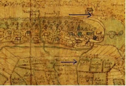 Auf der Karte: Pfeil oben: Diependall Hoff, Pfeil unten: Wolfskul